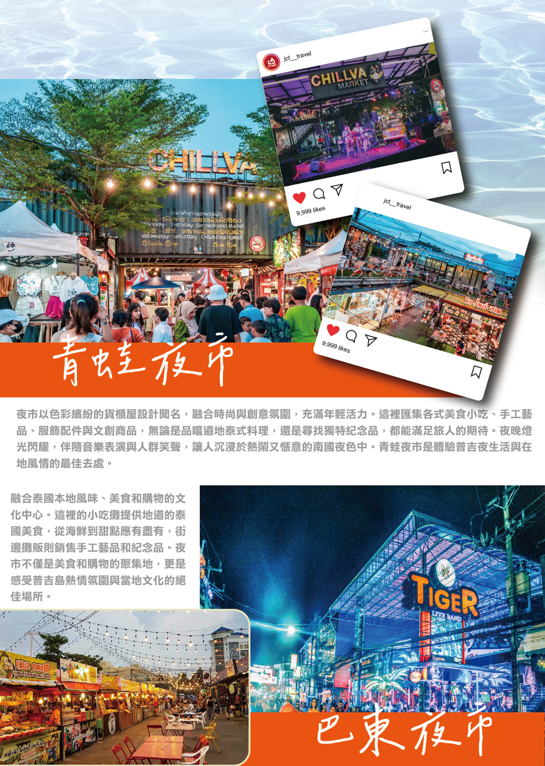 Chillva Market(音譯過來就是青蛙夜市),泰國普吉青蛙夜市有點國內夜市的感覺,基本上所有的商家都會説簡單中文,夜市很大,分為以下幾個部分。服裝區、雜物區、美食區、後街一整條酒吧街。美食眾多,環境乾淨。在這裡您也可以找到網紅跳跳蝦、香煎椰子糕、烤水母串、泰國牛奶、烤魷魚串、小鳳梨等等當地特色小吃;不定時還有現場演唱,邊享受美食邊聽演奏,也是另一番滋味。